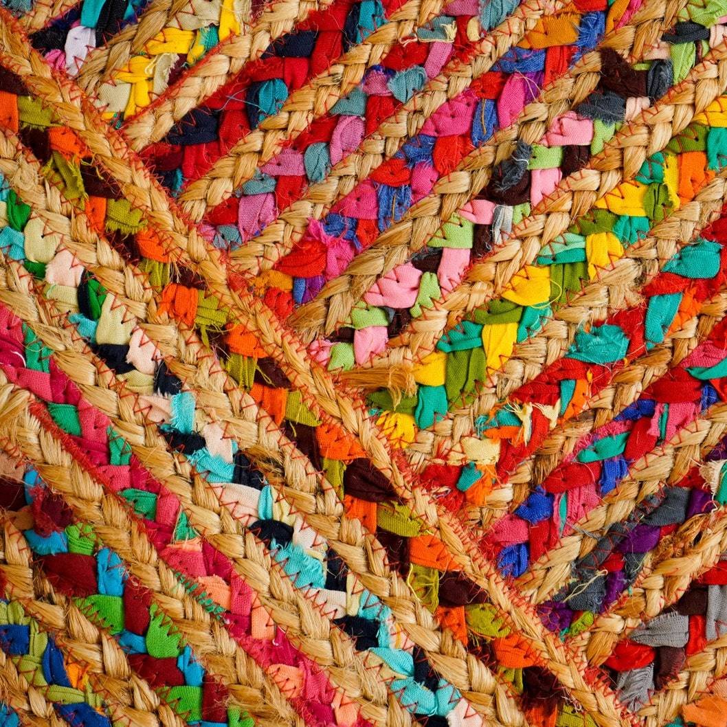 - Handcrafted from natural jute fibers and recycled cotton fabric strips