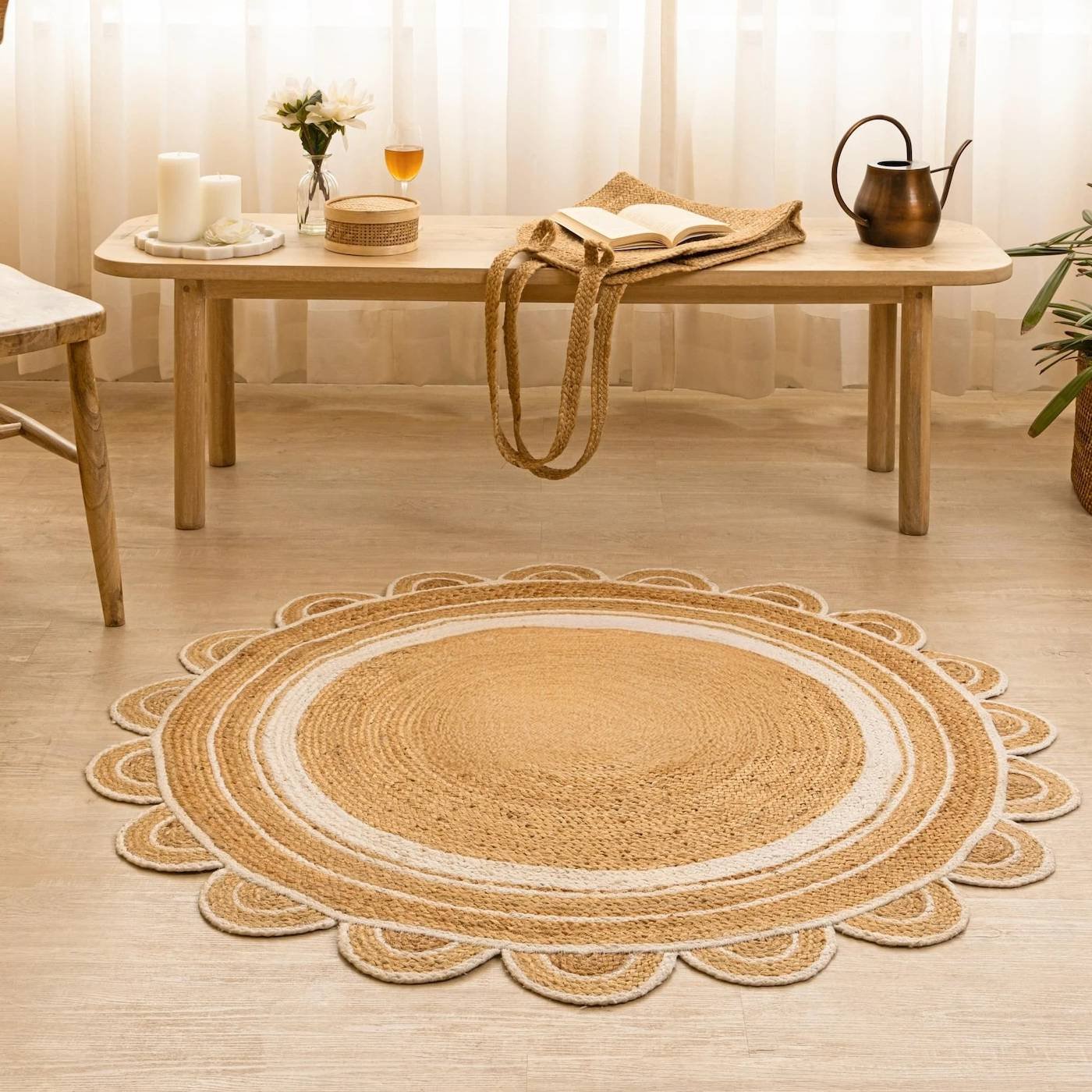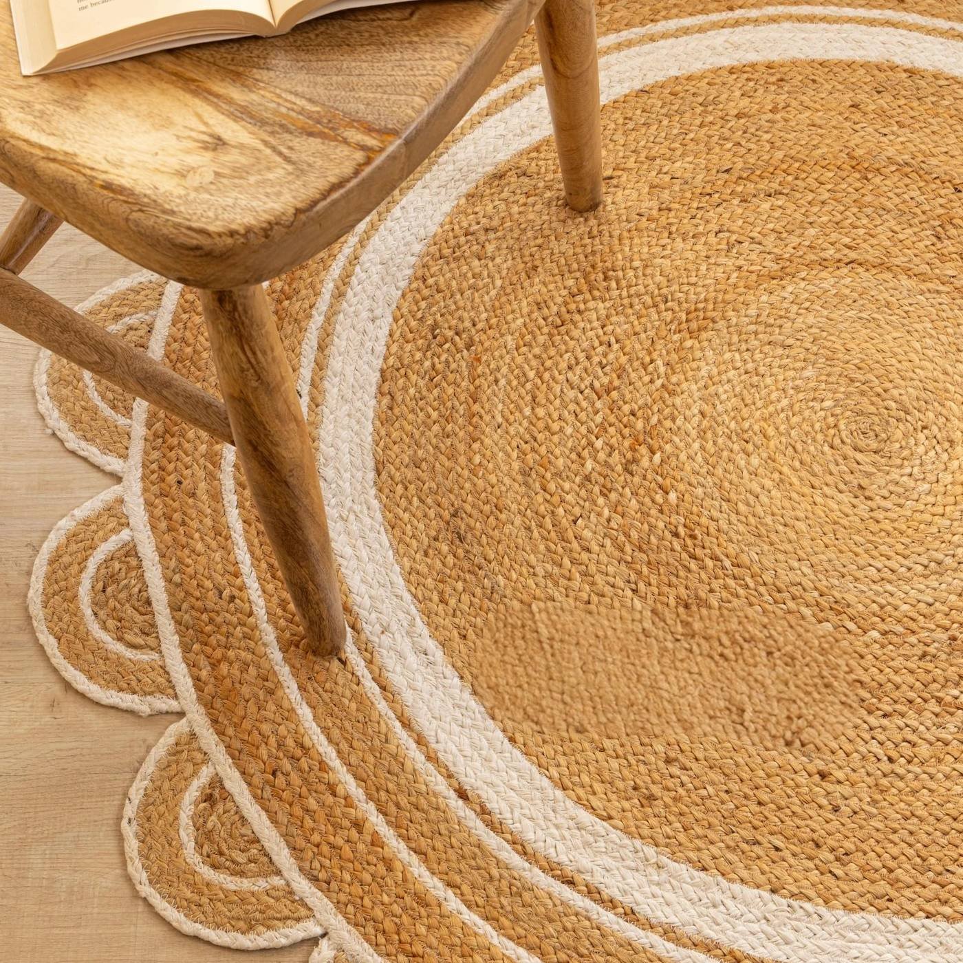 Elevate your space with this charming round jute rug featuring a playful scalloped edge